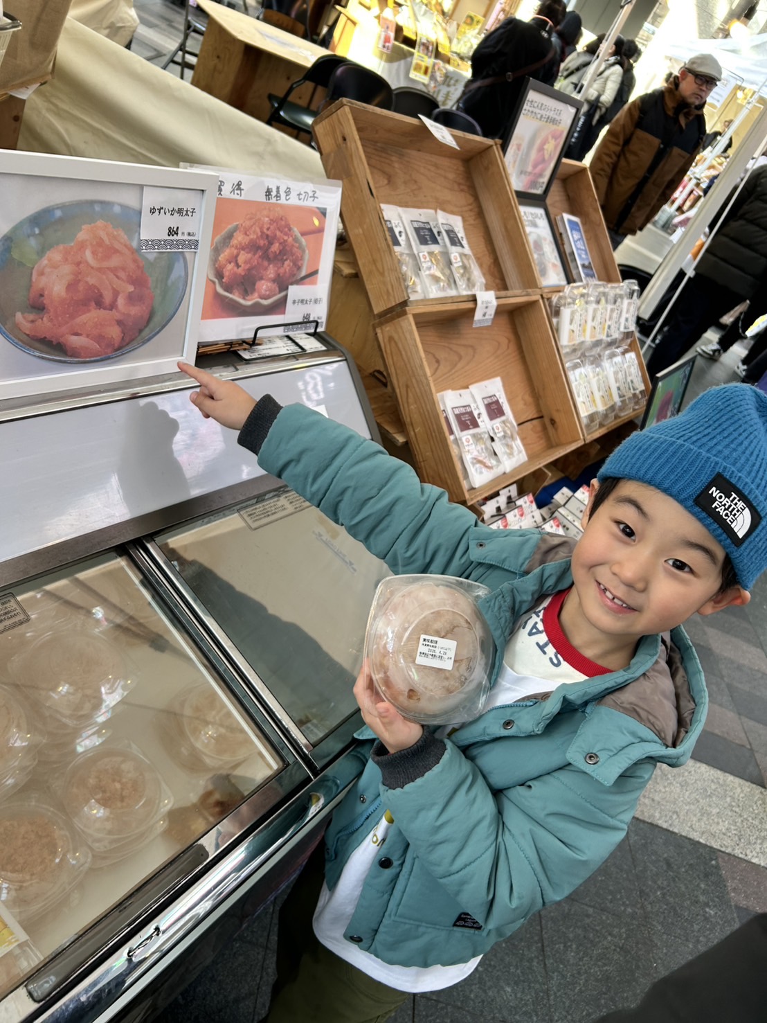 株式会社イリイチ食品さんの試食も大人気!明太子好きの長男は真っ先に向かっていました。