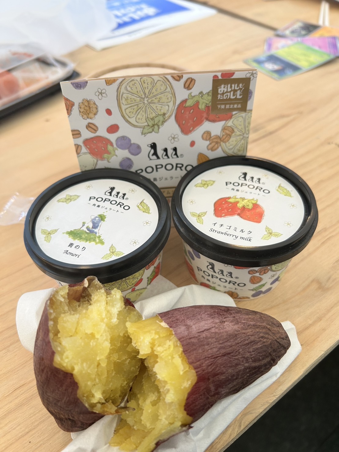 角島ジェラートポポロさんは温かい焼き芋にジェラート!子供達のリクエストで私達も購入。
