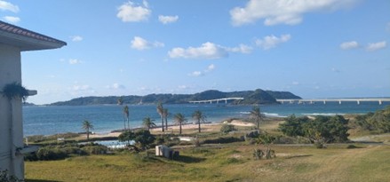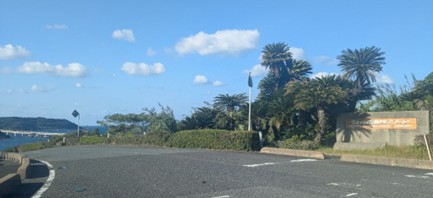 ホテル西長門リゾート入口の風景。青空とヤシの木、海が見えます!