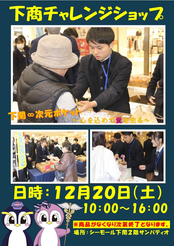 下関商業高等学校の生徒が設立した“模擬株式会社”による販売実習イベント「第21回 下商チャレンジショップ 2025」が、12月20日(土)にシーモール下関で開催されます。